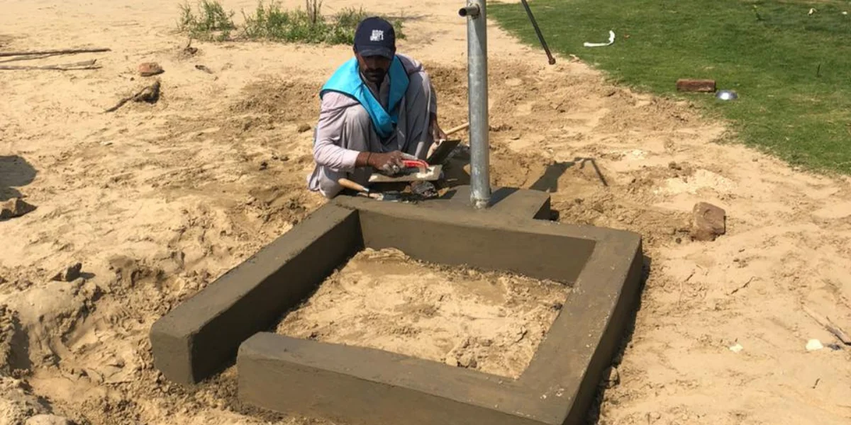 After installation, our masons construct a cemented platform and drainage ramp. We plaster, seal, and paint the area to create a clean, safe zone around the pump.